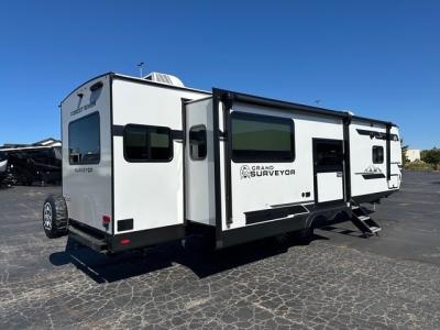 With any Grand Surveyor travel trailer by Forest River you will enjoy turn-key ready-to-go features and quality construction! Each model includes Azdel composite walls and a gel coated fiberglass front cap with an automotive style tinted windshield for a sleek look. There are friction hinge black glass entry door(s), an adjustable platform step with a night light, plus Goodyear tires and a power tongue jack for easy towing. The interior will have you feeling right at home with roller shades, residential faucets, sinks, and bathroom vanity, plus Surf(x) seamless countertops throughout. You can also plan for adventure with a 2" rear accessory and exterior spray port, and there are slam latch exterior baggage doors throughout to keep all your gear secure. Other stand-out features include a central vacuum system, a 200 watt solar panel with a 30 amp controller, a tankless water heater, carpet-free interiors, and the list goes on!