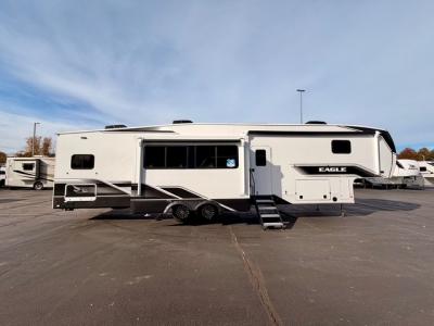 With any Eagle fifth wheel by Jayco you will appreciate durable construction materials, like the Magnum Truss Roof and the Stronghold VBL laminated walls. The JAYCOMMAND Smart RV system puts you in control of your RV's functions, and the 5 Star Handling Package will provide smooth towing from home to camp. Each model features Climate Shield zero-degree tested weather protection and the industry-exclusive HELIX cooling system that features two 15,000 BTU Whisper Quiet A/C's to keep you comfortable year around. Some of the exterior conveniences you are sure to love are the pass-through storage with Slam-Latch baggage doors and an automotive style front cap with max turn radius. The Eagle fifth wheels are designed to make you feel at home with solid hardwood slide fascia, residential vinyl flooring throughout, 100% no floor vents, and blackout roller shades with reflective side throughout for added privacy and insulation.