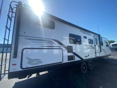 Sleeps 9 Slides 1 Length 36 ft 1 in Ext Width 8 ft Ext Height 10 ft 11 in Int Height 6 ft 6 in Interior Color Dune Gray Hitch Weight 750 lbs GVWR 8995 lbs Dry Weight 7295 lbs Cargo Capacity 1700 lbs Fresh Water Capacity 55 gals Grey Water Capacity 61 gals Black Water Capacity 30.5 gals Tire Size ST225/75R15E Furnace BTU 35000 btu Number Of Bunks 3 Available Beds Queen Refrigerator Type 12V Refrigerator Size 11 cu ft Cooktop Burners 3 Shower Size 30" x 36" Number of Awnings 1 LP Tank Capacity 20 lbs Water Heater Type On Demand Tankless AC BTU 13500 btu TV Info LED Smart TV Awning Info 20' Max-Length Power w/LED Light Axle Count 2 Number of LP Tanks 2 Shower Type Standard Electrical Service 30 amp Solar Wattage 200 watts Similar Travel Trailer Floorplans
