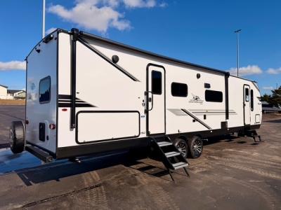 It's time to ditch that old tent and upgrade to this spacious travel trailer! The little ones or your guests will love the double-size bunks in the rear bunkhouse, along with a half bath and storage space for their things. You'll enjoy the front private bedroom all to yourselves with a queen bed and dual wardrobes, and the full bath is close by for easy nighttime use. A U-shaped dinette slide and sofa in the main living area provide your crew with space to relax and dine together, and the fully equipped kitchen lets you cook up your best meals. Outside, you'll find exterior storage, a 20' power awning, plus an outdoor kitchen to enjoy a sunrise breakfast!