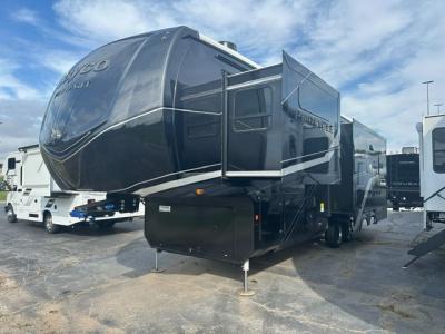 Sleeps 4 Slides 3 Length 36 ft 5 in Ext Width 8 ft 6 in Ext Height 13 ft 3 in Int Height 8 ft 6 in Interior Color Modern Farmhouse, Vintage Farmhouse Exterior Color Midnight Charcoal, Midnight Gold, Silver Metallic Hitch Weight 2485 lbs GVWR 16600 lbs Dry Weight 13530 lbs Cargo Capacity 3070 lbs Fresh Water Capacity 75 gals Grey Water Capacity 87 gals Black Water Capacity 50 gals Tire Size 215/75R17.5"H Furnace BTU 40000 btu Available Beds King Refrigerator Type Residential Refrigerator Size 21 cu ft Convection Cooking Yes Cooktop Burners 4 Number of Awnings 2 LP Tank Capacity 40 Water Heater Capacity 16 gal Water Heater Type Gas/Electric DSI AC BTU 30000 btu TV Info LR 50" Smart LED HDTV, BR & EXT 32" 4K Smart LED TV Awning Info 10' and 16' Electric with LED Lights Axle Count 2 Washer/Dryer Available Yes Number of LP Tanks 3 Shower Type Walk-In Shower Electrical Service 50 amp Similar Fifth Wheel Floorplans