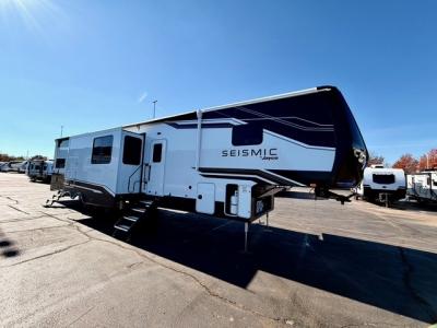 Take your outdoor adventures up a notch with this Seismic toy hauler. You can take the whole gang along for some fun with triple slides and dual entry for easy access going in and out. Your friends will sleep comfortably on the convertible sofas with overhead queen bed above in the 14' cargo garage space. There is also a storage space/loft above for their things and additional sleeping if needed. Inside, a full bath can be shared by all to get cleaned up each day, and all can gather inside in the spacious living area featuring dual opposing slides. Theater seating and an L-shaped tri-fold sofa create plenty of space for lounging. There is also a dining table for four inside and the second table in the garage area allows for more seating during meals inside when the weather isn't that nice. Two side awnings provide protection from the elements, along with a rear awning, and the rear ramp party deck with steps create even more outdoor living space to enjoy!