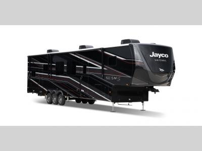 One look at the Seismic toy haulers by Jayco, and you'll never go back! Each model features a custom automotive-grade vinyl exterior graphics package, a painted fiberglass front cap with built-in LED lighting, and 102" wide-body structural steel I-beam construction. You'll find the pass-through storage with Slam-Latch baggage doors will make unpacking easier than ever, and the rear ramp door/patio with anti-slip, non-skid flooring will allow you to unload your toys with no trouble at all. These toy haulers feature a three seasons garage wall/doors, a 30 gallon fuel tank with a timer, and exterior marine-grade speakers to keep the party going. The Climate Shield zero degree tested weather protection includes a 35,000 BTU furnace, PEX plumbing, and a fully enclosed and heated underbelly so you can enjoy your adventures year around. And we haven't even touched on the interior luxuries you'll find, like solid hardwood cabinet doors, residential vinyl flooring made in the USA, night shades, and more!
