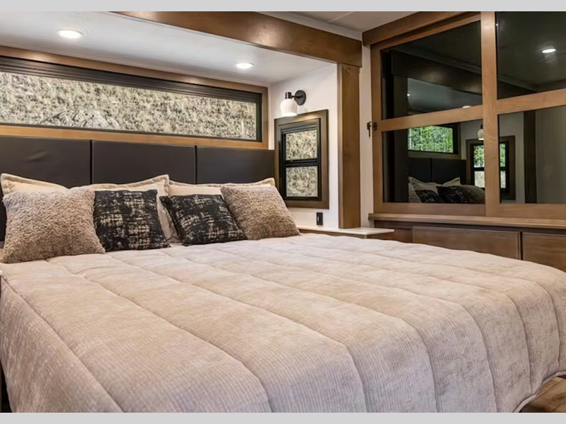 Sleeps 6 Slides 5 Length 42 ft 7 in Ext Width 0 ft Ext Height 13 ft 4 in Interior Color Oakmont Exterior Color Volcano, Cobalt, Sterling, Glacier Full-Body Paint Choices Hitch Weight 2810 lbs Dry Weight 15644 lbs Cargo Capacity 2356 lbs Fresh Water Capacity 70 gals Grey Water Capacity 78 gals Black Water Capacity 39 gals Tire Size 215/75R17.5H Furnace BTU 35000 btu Available Beds King Refrigerator Type Residential w/ Ice maker Refrigerator Size 18 cu ft Convection Cooking Yes Cooktop Burners 3 Shower Size 48" x 30" Number of Awnings 2 LP Tank Capacity 30 lbs Water Heater Type On Demand AC BTU 45000 btu TV Info Smart HDTV; LR, BR Awning Info 13' & 16' Electric with LED Lights Axle Count 2 Washer/Dryer Available Yes Number of LP Tanks 2 Shower Type Shower w/Seat Electrical Service 50 amp Similar Floorplans