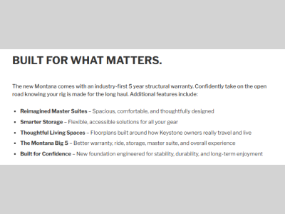 Enjoy luxury, innovation, and the outdoors in any one of Montana's finest fifth wheels. Each set the standard with exceptional features, and exciting factory installed options to provide you a great home on the road. Keystone's 12" I-beam chassis with z-frame technology provides a strong and durable foundation to your fifth wheel, and the four-season living package will help extend your camping season. There are also square frameless windows outside, along with storage solutions, and a hydraulic leveling system that will have you set up in no-time! Inside, you'll love the hardwood cabinetry, solid surface countertops, spacious showers, and cozy bedrooms!