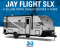 The Jayco Jay Flight SLX travel trailer is quite easy to own because it is lightweight for an easier towing experience. Built on a fully integrated A-frame with galvanized-steel, impact-resistant wheel wells, the Jay Flight SLX has quality at its very foundation. That quality continues on to the electric self-adjusting brakes, easy-lube hubs, Magnum Truss roof system, and LP quick connect. Some of what the mandatory Customer Value Package includes is backup camera prep, Keyed-Alike entry and baggage doors, and an on-demand tankless water heater.ย